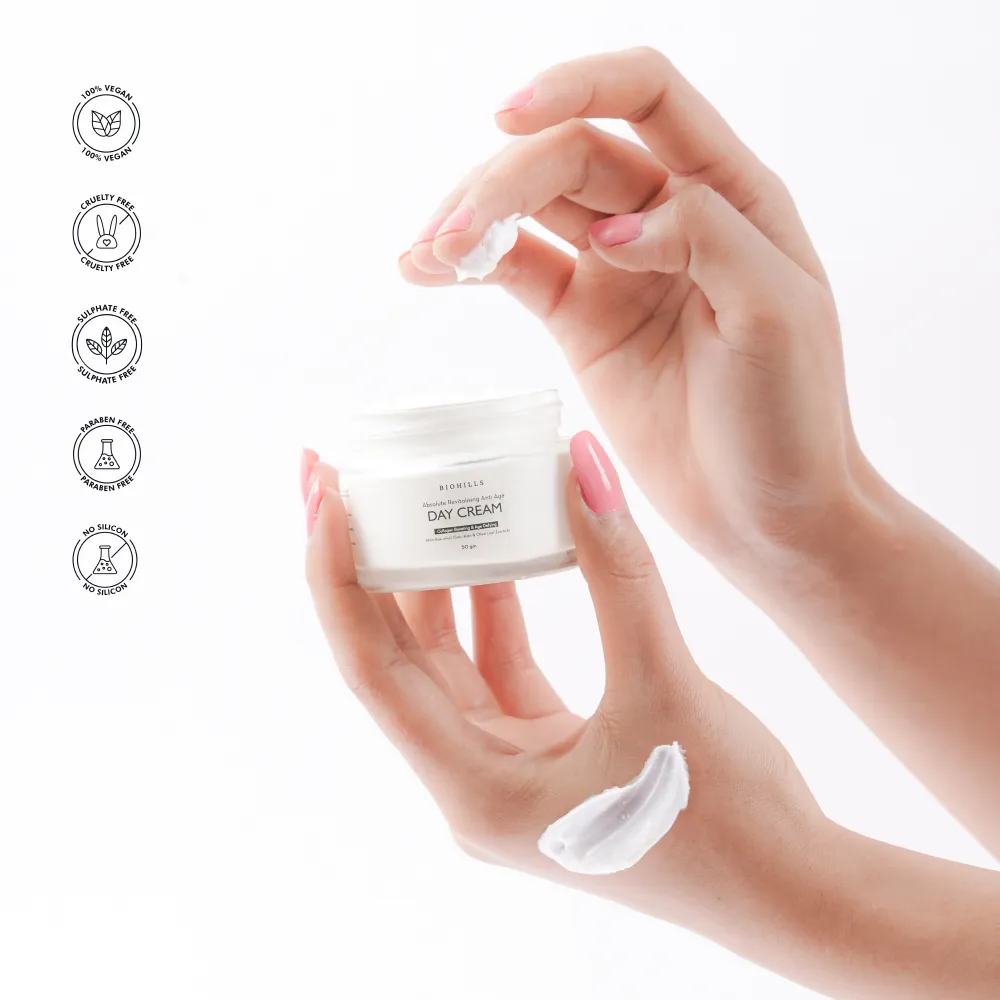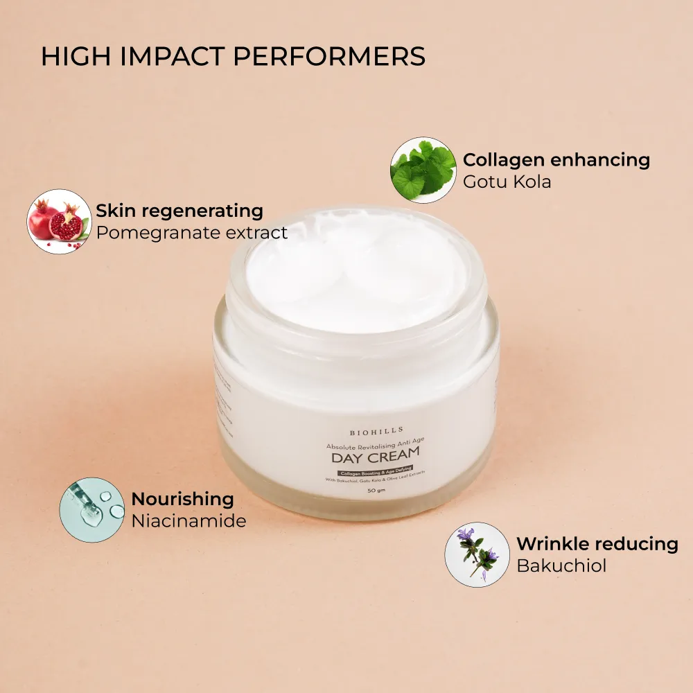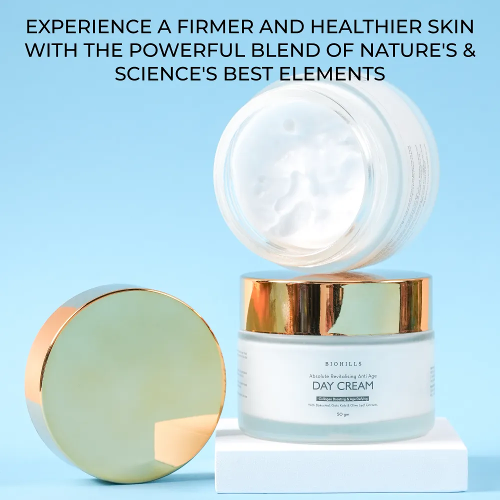 Introducing Biohills Absolute Revitalising Anti-Age Day Face Cream, your ultimate defense against aging. Formulated with powerful ingredients like Pomegranate Extract, Olive Leaf Extract, Gotu Kola, Bakuchiol, and Niacinamide. Pomegranate Extract fights free radicals and promotes skin regeneration, reducing signs of aging. Olive Leaf Extract offers antioxidant protection and soothes the skin, keeping it healthy and youthful. Gotu Kola stimulates collagen production, enhancing skin elasticity and firmness. Bakuchiol, a natural retinol alternative, reduces fine lines and wrinkles, improving overall skin texture. Niacinamide improves skin elasticity, evens skin tone, and reduces the appearance of dullness and fine lines. Experience the transformative power of Biohills Absolute Revitalising Anti-Age Day Face Cream. Revitalize your skin, naturally.