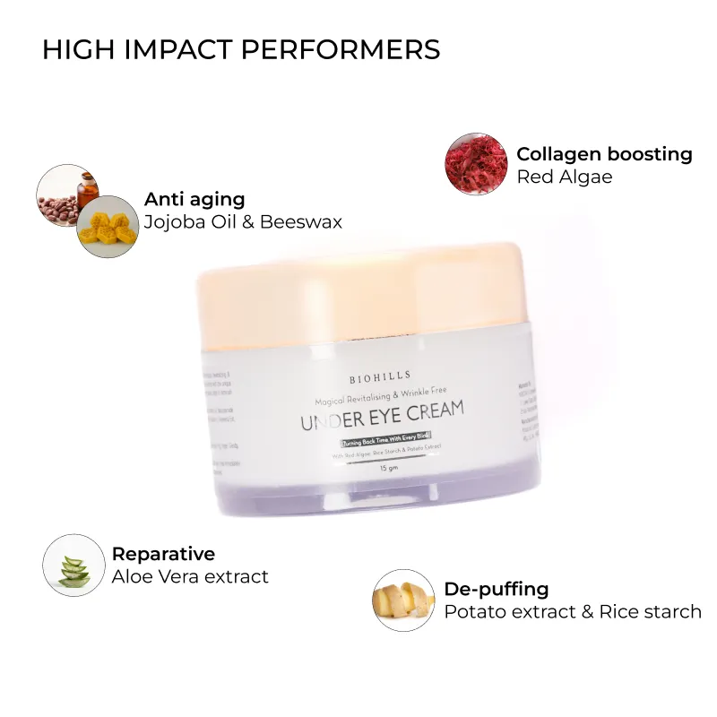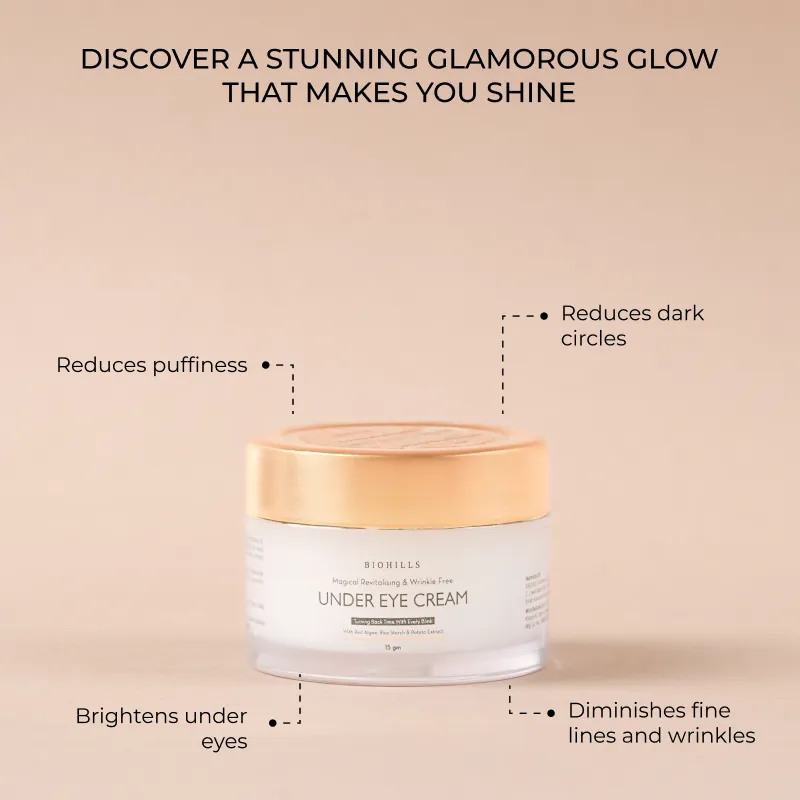 Introducing Biohills Magical Revitalising and Wrinkle-Free Under Eye Cream, your secret to youthful, bright eyes. This powerful formula combines Red Algae and Aloe Vera Extract to reduce fine lines and wrinkles while providing deep hydration and promoting skin repair. Potato Extract and Rice Starch lighten dark circles and reduce puffiness, leaving your under-eye area refreshed and bright. Beeswax and Jojoba Oil lock in moisture, keeping your skin smooth and supple. Experience the magic of Biohills for naturally wrinkle free eyes.