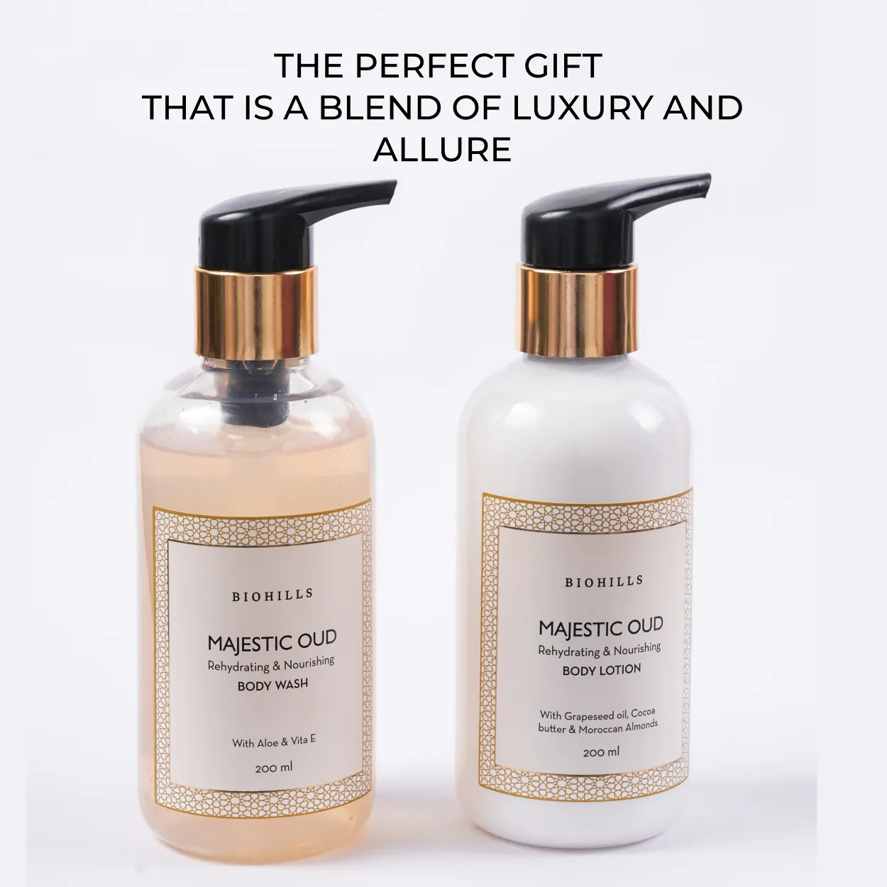 Introducing Biohills' 'Arabian Dreams' gift box, a luxurious experience that transports you to the opulent world of Arabian dreams. This exquisite set features our Majestic Oudh body wash and lotion, both infused with the rich and captivating fragrance of Oudh. Perfect for anyone who appreciates the finer things in life, this gift set embodies luxury and elegance. Whether it's for a loved one or a well-deserved treat for yourself, Biohills' 'Arabian Dreams' is the perfect choice to elevate any gifting occasion. Experience the joy of gifting with Biohills and indulge in the dreamy essence of Arabian luxury.
