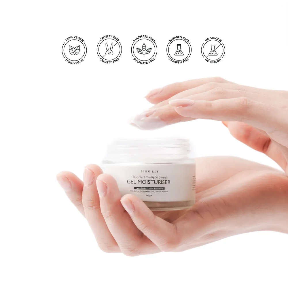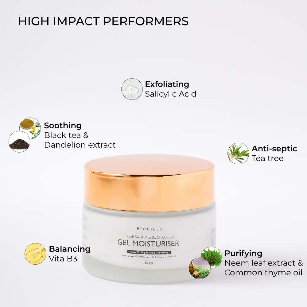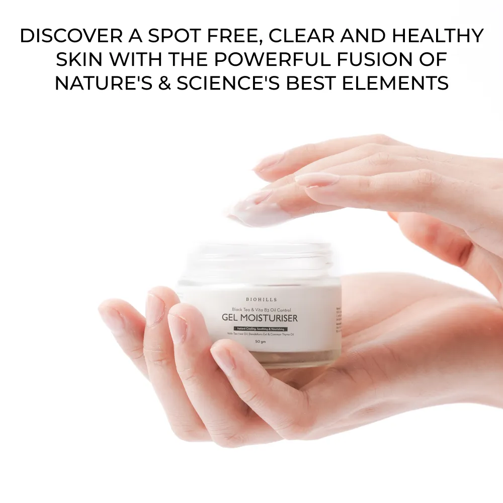 Introducing Biohills Black Tea & Vitamin B3 Oil Control Gel Moisturiser, your go-to solution for clear and balanced skin. This advanced formula combines Salicylic Acid to unclog pores and prevent breakouts, with Tea Tree Oil and Neem Leaf Extract to fight acne-causing bacteria and reduce inflammation. Vitamin B3 helps control oil production and minimizes pores, while Black Tea and Dandelion Extracts soothe and calm your skin. Common Thyme Oil adds an extra layer of antibacterial protection. Experience the perfect blend of hydration and oil control with Biohills Black Tea & Vitamin B3 Oil Control Gel Moisturiser for a clear, refreshed complexion.
