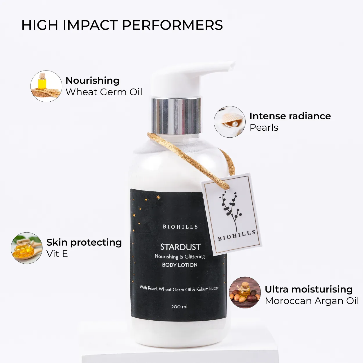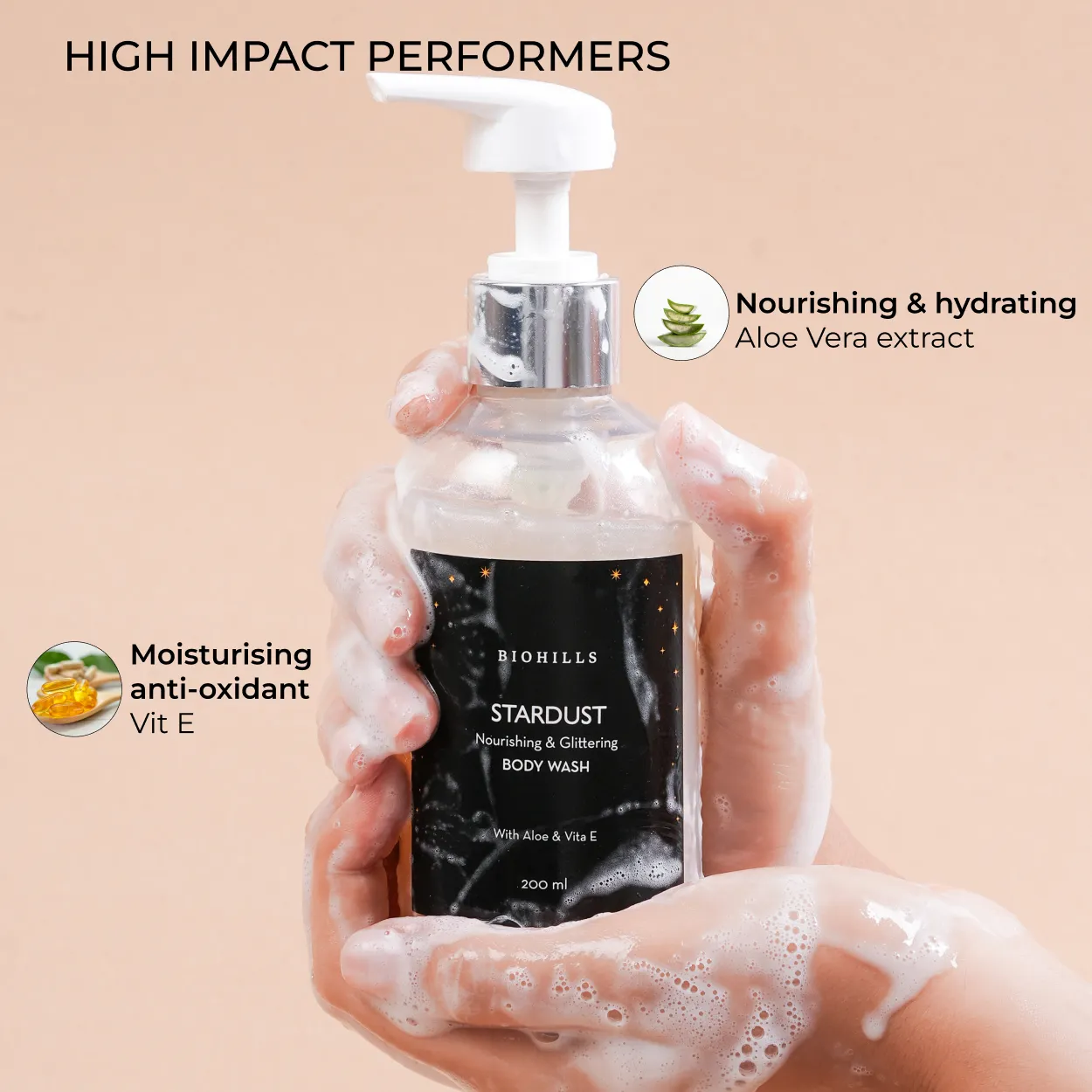 Introducing Biohills' 'Stardust Body Milk,' your ultimate skin indulgence. Infused with shimmering glitters, this luxurious body milk combines the radiance-boosting power of pearl extract with the deep nourishment of wheat germ oil and Moroccan argan oil. Kokum butter softens and repairs your skin, while vitamin E offers antioxidant protection and hydration. Perfect for adding a touch of sparkle to your skin, 'Stardust Body Milk' leaves you glowing and radiant, ready to shine at any occasion. Embrace the magic of glitter and the goodness of nature with Biohills. Introducing Biohills' 'Stardust Body Wash,' your ultimate shower indulgence. Infused with shimmering glitters, this luxurious body wash combines the hydrating and soothing properties of Aloe Vera extract with the antioxidant power of vitamin E. Aloe Vera deeply moisturizes and calms your skin, while vitamin E provides intense moisture and protection against free radicals. Perfect for adding a touch of sparkle to your daily routine, 'Stardust Body Wash' leaves your skin feeling refreshed, radiant, and beautifully soft. Embrace the magic of glitter and the benefits of nature with Biohills. Introducing Biohills Glow and Glitter Body Mist, your ultimate companion for sparkling at any party! Infused with golden glitters, this mist adds a touch of glamour to your look, making you shine bright all night. Enriched with Aloe Vera extract, Recutita flower extract (Chamomile), cucumber fruit extract, and Vitamin E, this mist not only adds a shimmering glow but also hydrates and nourishes your skin. Get ready to dazzle and shimmer with Biohills Glow and Glitter Body Mist. Glow like never before with Biohills.