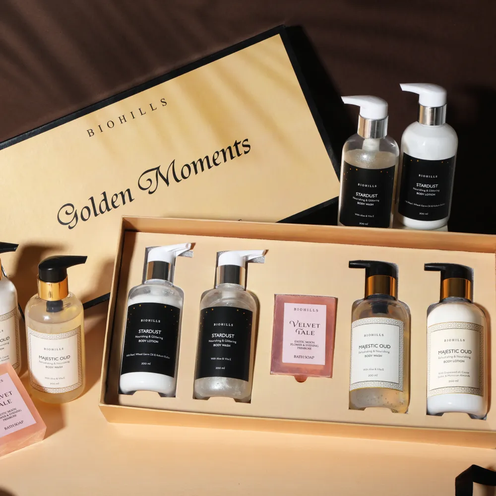 – A gift that exudes opulence with hand crafted soap, glitter based Stardust bath range and oudh based Majestic Oudh bath range.