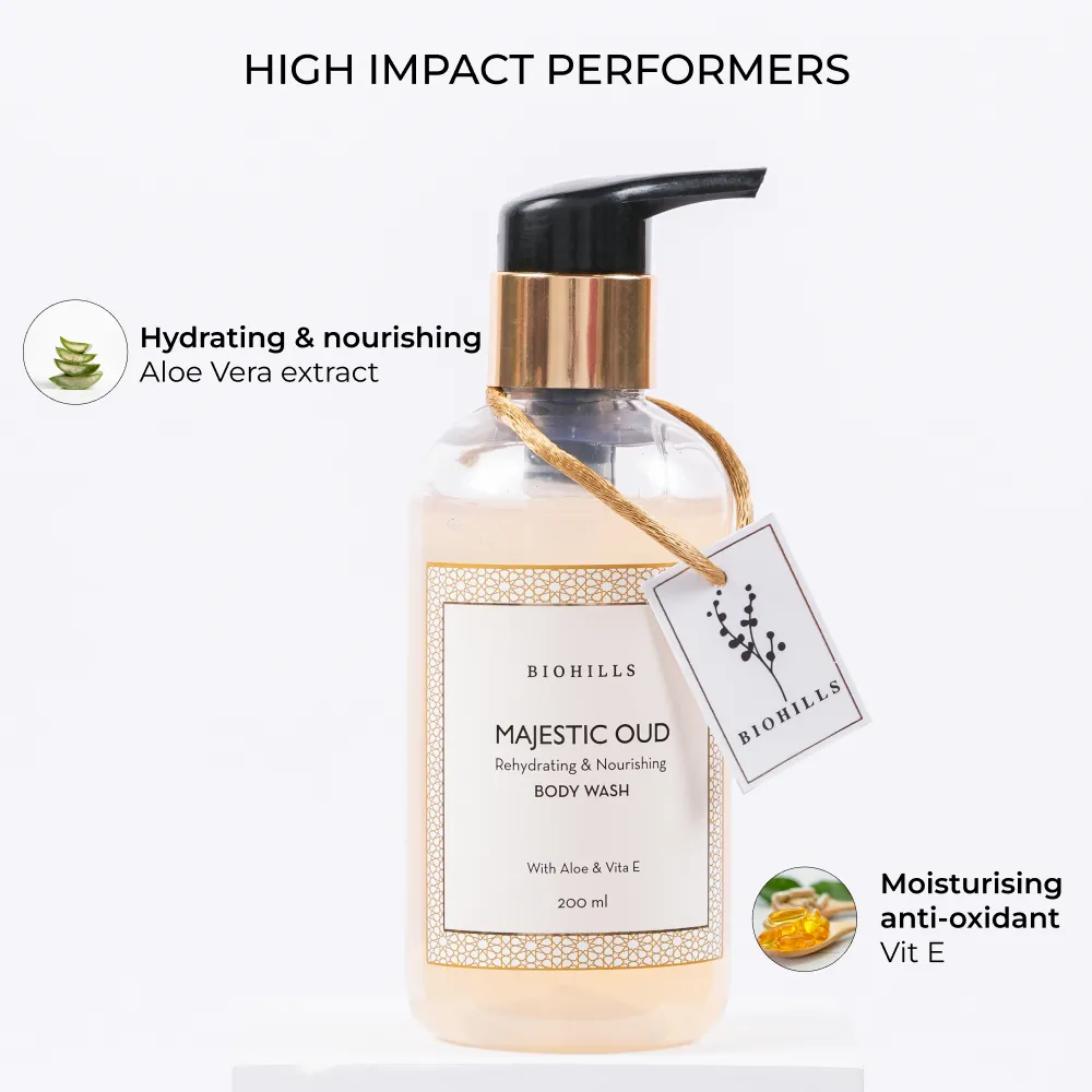 Introducing Biohills' 'Majestic Oudh Body Wash,' your luxurious escape to the exotic world of Oudh fragrance. Infused with the captivating scent of Oudh, this body wash indulges your senses while nourishing your skin. Enriched with Aloe Vera extract and vitamin E, it deeply hydrates and soothes, leaving your skin feeling refreshed and rejuvenated. Elevate your shower experience with Biohills' 'Majestic Oudh Body Wash' and embrace the luxury of Oudh.